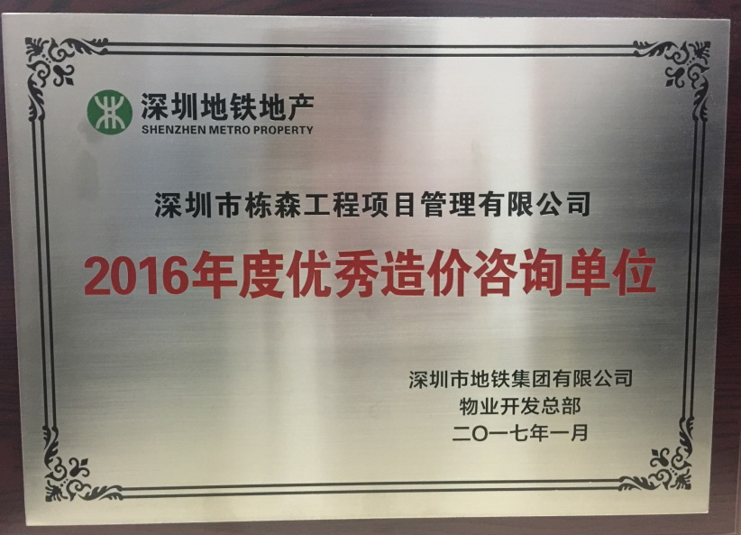 深圳市地鐵集團(tuán)有限公司物業(yè)開發(fā)總部2016年度優(yōu)秀造價咨詢單位 |